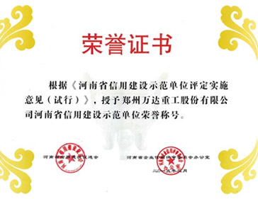 2016/01/28 558 熱烈祝賀鄭州萬(wàn)達(dá)重工股份有限公司通過(guò)了河南省信用建設(shè)促進(jìn)會(huì)和河南省企業(yè)信用評(píng)審委員會(huì)辦公室共同組織的河南省信用建設(shè)示范單位復(fù)審認(rèn)證,被認(rèn)定為河南省信用建設(shè)示范單位榮譽(yù)稱號(hào)!