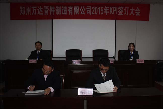 鄭州萬達(dá)管件制造有限公司2015年KPI簽訂會(huì)于1月30號(hào)在公司行政區(qū)會(huì)議室隆重舉行,公司班長(zhǎng)以上所有管理人員參加了此次簽訂會(huì)議。簽訂會(huì)分為三級(jí)簽訂,即:董事長(zhǎng)與總經(jīng)理簽訂、總經(jīng)理與公司各高管簽訂、公司各高管與分管的各部門負(fù)責(zé)人簽訂,近期,各部門負(fù)責(zé)人將部門的KPI指標(biāo)進(jìn)行分解,與各班組及相關(guān)崗位簽訂目標(biāo)責(zé)任書,達(dá)到“千斤重?fù)?dān)人人挑,人人肩上有指標(biāo)”的責(zé)任分解領(lǐng)受,確保最終順利完成公司2015年度各項(xiàng)任務(wù)和目標(biāo)。