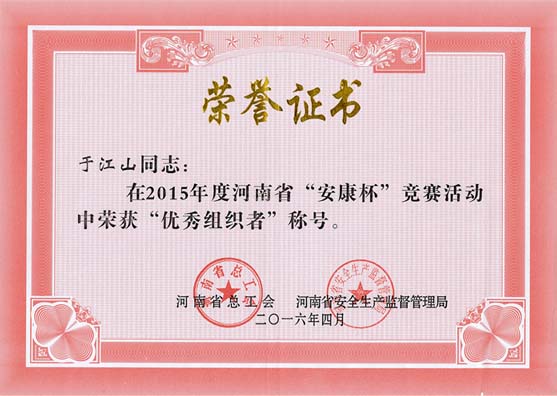 8月16日,河南省總工會與河南省安全生產(chǎn)監(jiān)督管理局對2015年度“安康杯”競賽先進集體和個人進行通報表彰,鄭州萬達重工股份有限公司繼2014年度獲得河南省“安康杯”后,再次榮獲2015年度省級“安康杯”競賽先進單位稱號,股份公司工會主席于江山榮獲河南省“安康杯”競賽活動“優(yōu)秀組織者”榮譽稱號。