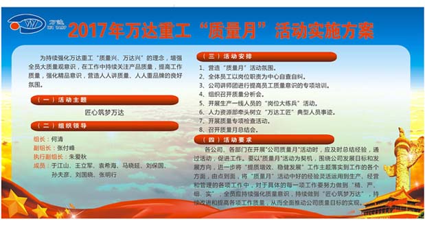 公司于2017年4月1號(hào)---4月30號(hào)舉辦以“匠心筑夢(mèng)萬(wàn)達(dá)”為主題的質(zhì)量月活動(dòng)。為持續(xù)強(qiáng)化萬(wàn)達(dá)重工“質(zhì)量興、萬(wàn)達(dá)興”的理念,增強(qiáng)全員大質(zhì)量觀意識(shí),在工作中持續(xù)關(guān)注產(chǎn)品質(zhì)量,提高工作質(zhì)量,強(qiáng)化精品意識(shí),營(yíng)造人人講質(zhì)量、人人重品牌的良好氛圍,增強(qiáng)企業(yè)凝聚力和市場(chǎng)競(jìng)爭(zhēng)力。