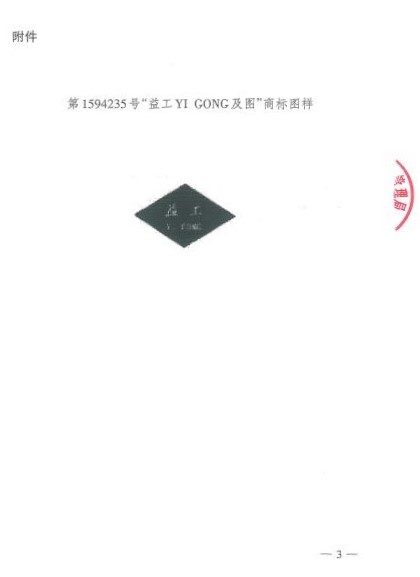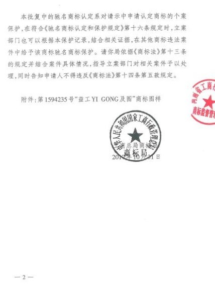 根據(jù)國家工商行政管理總局商標局下發(fā)的商標馳字【2017】108號《工商總局商標局關(guān)于認定“益工 YI GONG及圖”商標為馳名商標的批復(fù)》文件,公司使用在商標注冊用商品和服務(wù)國際分類第6類金屬管道配件商品上的“第1594235號益工YI GONG及圖”商品被認定為中國馳名商標”,這不僅是公司商標保護的重大成果,也實現(xiàn)了鄭州航空港經(jīng)濟綜合實驗區(qū)馳名商標零的突破。