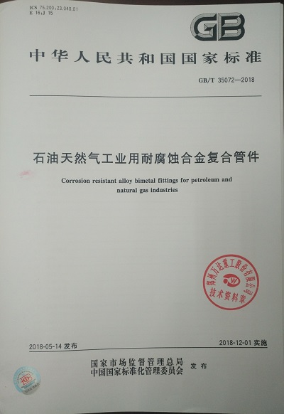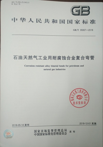 2018年5月14日,國家市場(chǎng)監(jiān)督管理總局、國家標(biāo)準(zhǔn)化管理委員會(huì)聯(lián)合發(fā)布了《中華人民共和國國家標(biāo)準(zhǔn)公告》【2018年6號(hào)】,鄭州萬達(dá)重工股份有限公司參與編制的GB/T35067-2018《石油天然氣工業(yè)用耐腐蝕合金復(fù)合管件》和GB/T35072-2018《石油天然氣工業(yè)用耐腐蝕合金復(fù)合彎管》兩項(xiàng)標(biāo)準(zhǔn)在此次公告之列。