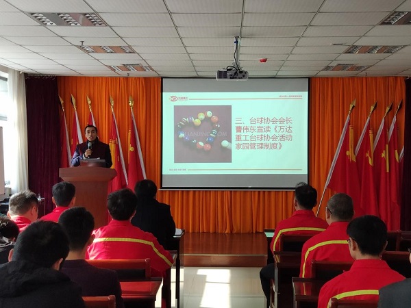 為豐富員工業(yè)余文化生活,共創(chuàng)幸福萬達事業(yè),在公司領(lǐng)導(dǎo)的大力支持下,在萬達重工工會辦的牽頭下,萬達重工臺球協(xié)會成立大會于2018年11月29日在公司二樓會議室隆重召開,萬達重工臺球協(xié)會全體成員參加了本次大會。公司袁總、馬總、劉總等公司高管前來表示祝賀。
