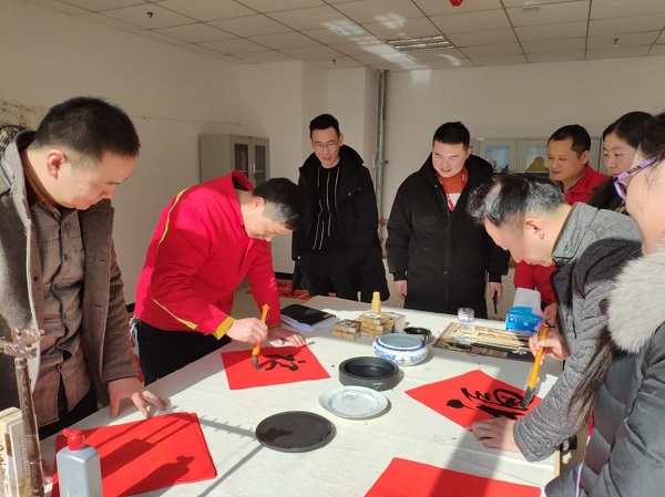 當(dāng)天中午,在工會(huì)主席于江山的帶領(lǐng)下,股份公司書法愛好者王英豪、劉松橋、靳奎、梁?jiǎn)⒊?、張珊珊等人在書畫閱覽室擺開書案,攤開紅紙,揮毫潑墨,寫福字、寫對(duì)聯(lián),紅彤彤的福字和對(duì)聯(lián)將現(xiàn)場(chǎng)點(diǎn)綴出濃濃的年味兒。