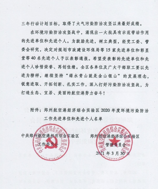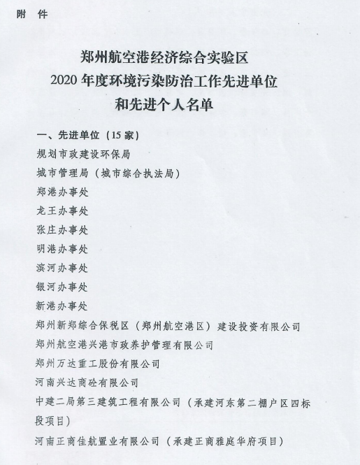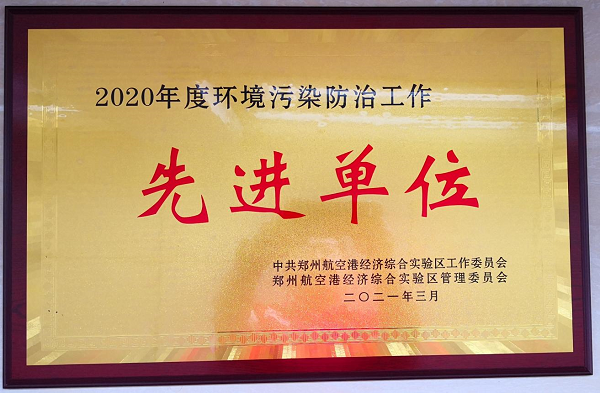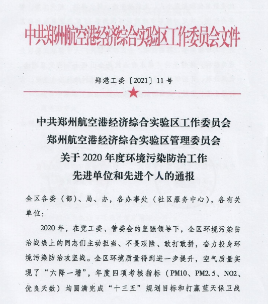 鄭州萬達重工股份有限公司榮獲鄭州航空港經濟綜合實驗區(qū)2020年度環(huán)境污染防治工作先進單位