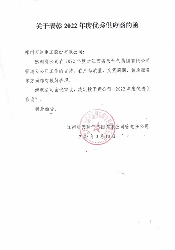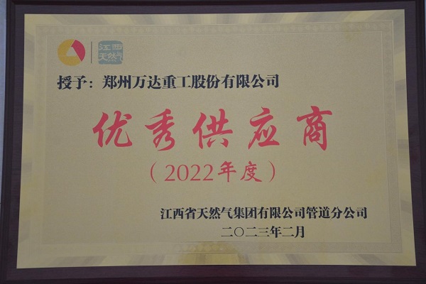 近日,鄭州萬達(dá)重工股份有限公司收到了江西省天然氣集團(tuán)有限公司管道分公司頒發(fā)的2022年度“優(yōu)秀供應(yīng)商”榮譽(yù)獎牌,獲得該公司2022年度優(yōu)秀供應(yīng)商榮譽(yù)稱號。業(yè)主方對公司所承接彎管項(xiàng)目的產(chǎn)品質(zhì)量、交貨周期、售后服務(wù)等方面給予高度贊揚(yáng)。