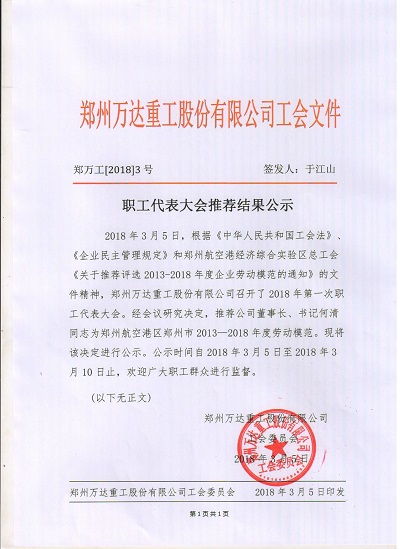 2018/03/08 3293 2018年3月5日,根據(jù)《中華人民共和國(guó)工會(huì)法》、《企業(yè)民主管理規(guī)定》和鄭州航空港經(jīng)濟(jì)綜合實(shí)驗(yàn)區(qū)總工會(huì)《關(guān)于推薦評(píng)選2013-2018年度企業(yè)勞動(dòng)模范的通知》的文件精神,鄭州萬(wàn)達(dá)重工股份有限公司召開(kāi)了2018年第一次職工代表大會(huì)。經(jīng)會(huì)議研究決定,推薦公司董事長(zhǎng)、書(shū)記何清同志為鄭州航空港區(qū)鄭州市20132018年度勞動(dòng)模...
