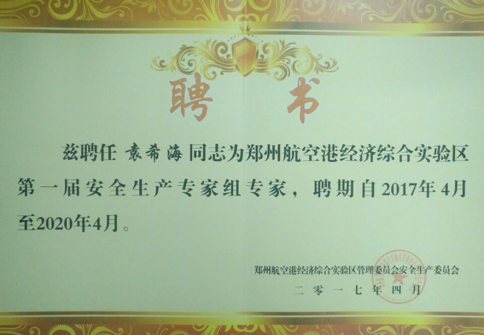 熱烈祝賀鄭州萬達(dá)重工股份有限公司總工程師袁希海同志成為第一屆鄭州航空港 經(jīng)濟(jì)綜合實驗